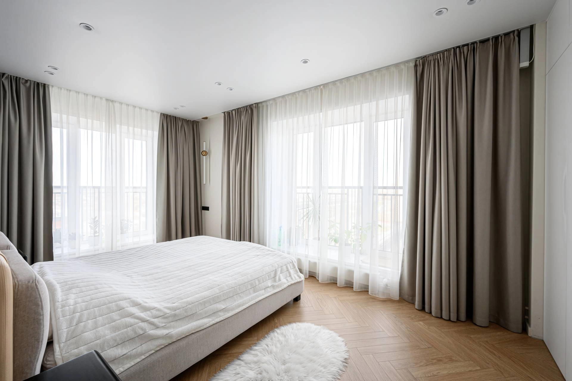 Layering these window treatments with a blackout lining or room-darkening shade can provide the darkness and privacy needed for a good night’s rest.